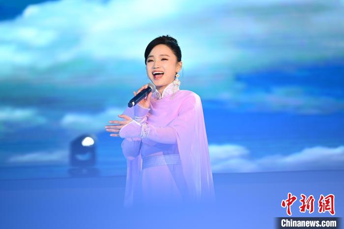 图为中国内地蒙古族女军旅歌唱家、世界非物质文化遗产蒙古族长调民歌传承者乌英嘎演唱蒙古族歌曲。中新社记者 李亚龙 摄