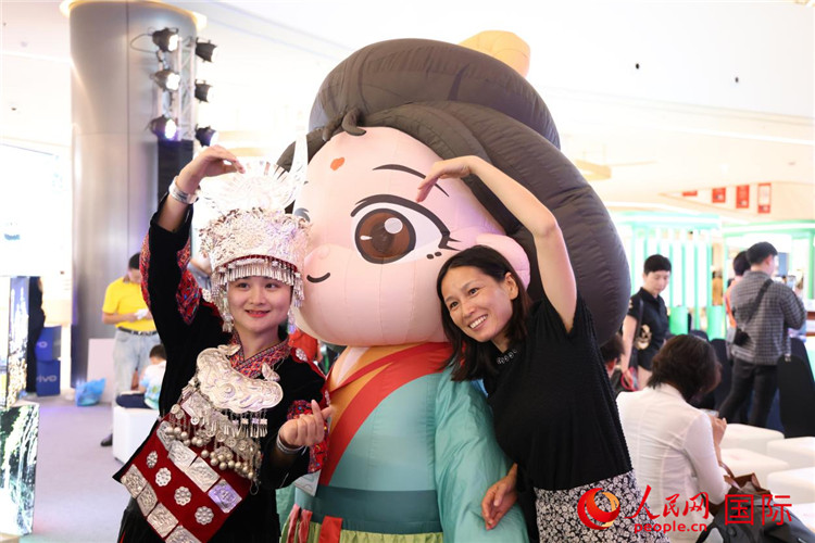 活动现场,泰国民众与身着少数民族服饰的重庆代表团旅游推介人员合影。人民网记者 杨一摄