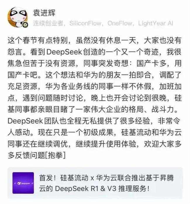 这其中,DeepSeek和华为自不用说。硅基流动作为一家AI Infra(AI基础设施)企业,则是清华博士袁进辉2023年刚创立的创业公司。