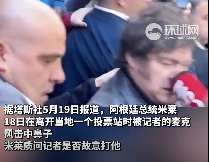 5月19日报道,阿根廷总统米莱18日在离开当地一个投票站时被一名记者的麦克风击中鼻子,米莱质问记者是否故意打他。