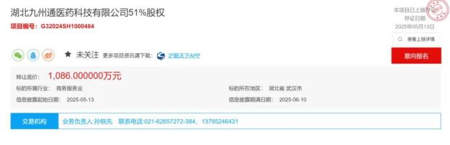 2025年5月13日,上海联合产权交易所挂牌信息显示,转让方华润三九医药股份有限公司(000999.SZ)挂牌转让湖北九州通医药科技有限公司51%股权,转让底价为1086万元,披露结束日期为2025年6月10日。