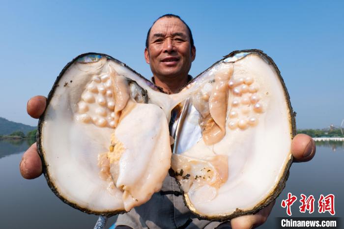 2025年,浙江德清,农户展示自己养殖的淡水珍珠。王力中供图