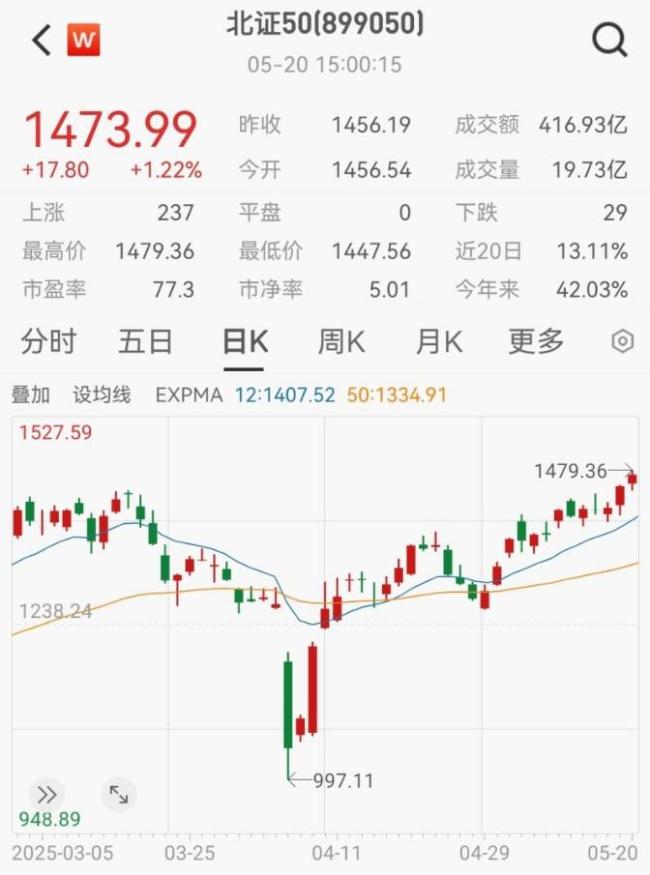 北证50指数创下历史新高。5月20日,该指数收盘报1473.99点,涨幅为1.22%,创下了新的历史高点。盘中最高触及1479.37点,超过了2024年11月的1469.57点。