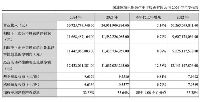 根据迈瑞医疗2024年年报显示,2024年实现营业收入367.26亿元,同比增长5.14%,归属于上市公司股东的净利润116.68亿元,同比增长0.74%,归属于上市公司股东的扣非净利润114.42亿元,同比增长0.07%。