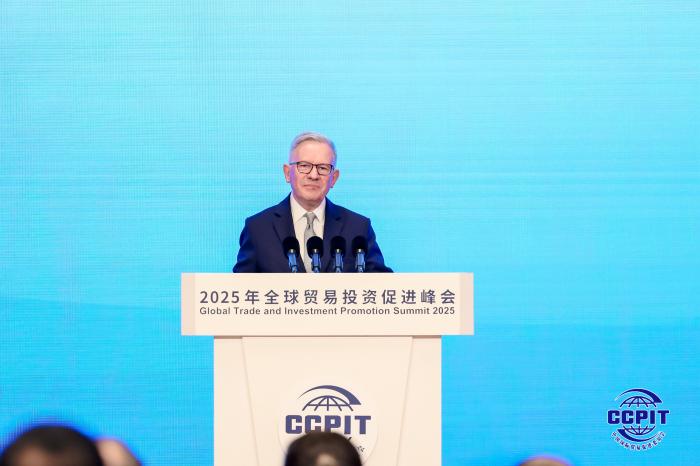5月22日,由中国贸促会主办的2025年全球贸易投资促进峰会在北京举行。英中贸易协会主席古沛勤爵士(Sir SherardCowper-Coles)在开幕式致辞。中国贸促会供图