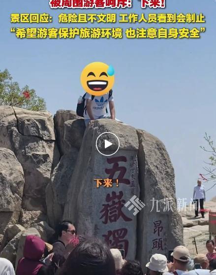 泰山谈男子踩五岳独尊石拍照 景区明确禁止攀爬。5月20日,山东泰安泰山景区发生了一起游客擅自攀爬标志性石刻“五岳独尊”拍照留念的事件。视频显示,一名男性游客在游览过程中攀爬至该石刻上,期间周边多名游客大声呵斥,提醒他不可以上去。
