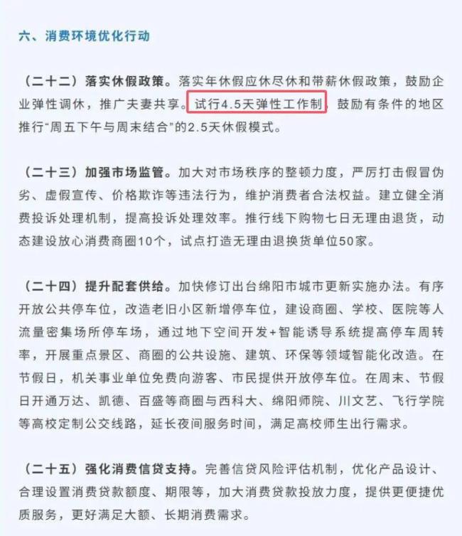 《绵阳市提振消费专项行动2025年工作清单》显示,落实年休假应休尽休和带薪休假政策,鼓励企业弹性调休,推广夫妻共享。试行4.5天弹性工作制,鼓励有条件的地区推行“周五下午与周末结合”的2.5天休假模式。