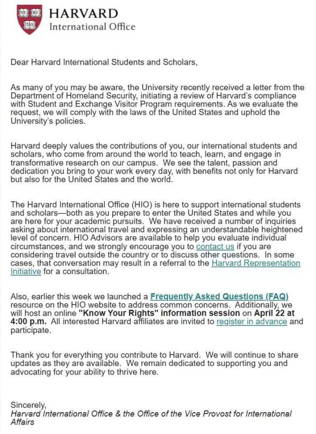 4月14日,加伯在公开信中严词拒绝了特朗普政府向哈佛大学提出的整改要求,称哈佛“不会牺牲其独立性,不会放弃宪法赋予的权利”。这封公开信在校内获得了广泛支持。李思瀚表示,这次学校内部比较团结,大部分人都支持校长的决定,这对国际生来说也是一剂强心针。