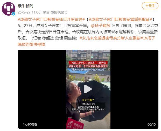 5月27日,成都女子在家门口被害案开庭。庭审结束后,合议庭决定择日审理此案,原因是需要重新取证。