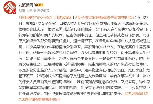如果物业存在相应的责任,比如小区门禁管理不严,让精神状态不稳定的梁某轻易进入危险区域,或者在事件发生时,物业的保安人员没有及时赶到现场制止,没有尽到合理的救助义务,又或者说,物业早就知道梁某有精神疾病和潜在的危险,但没有采取任何防范措施,一旦认定物业存在管理过错,物业也要按照过错程度承担相应的民事赔偿责任。