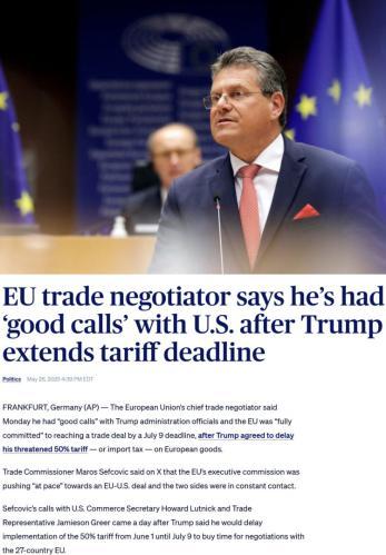 他25日告诉记者,自己当天与欧盟委员会主席冯德莱恩“愉快”地通了电话,并应对方要求,决定将原计划从6月1日开始对欧盟加征的50%的关税推迟到7月9日,以便双方有时间就此进行谈判。