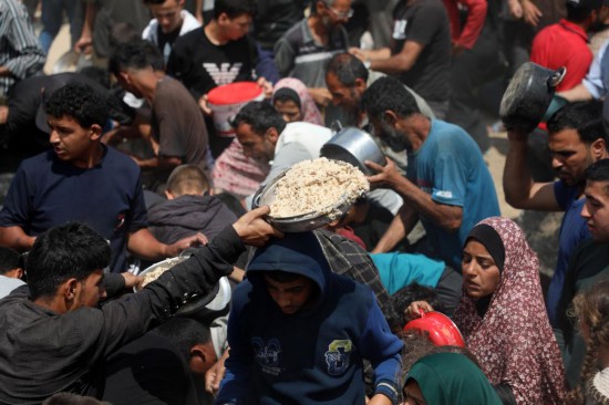 5月2日,人们在加沙城领取救助食物。新华社发(里泽克·阿卜杜勒贾瓦德摄)
