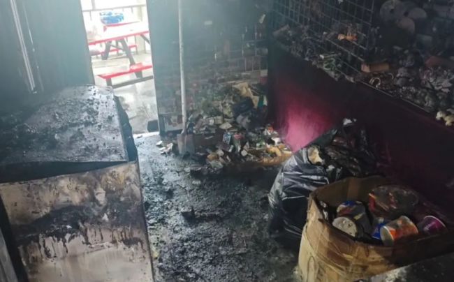 尽管现场明火已被扑灭,小卖部内仍弥漫着刺鼻的浓烟,一片狼藉,周围的货物也被熏烤得面目全非。救援人员立即进屋清理现场,并仔细排查冰柜及周边电路,以确保没有潜在的火源或漏电风险,防止复燃。