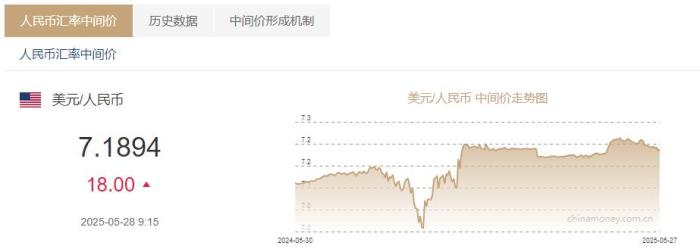 中新网5月28日电 据中国外汇交易中心网站消息,中国人民银行授权中国外汇交易中心公布,2025年5月28日银行间外汇市场人民币汇率中间价为:1美元对人民币7.1894元。
