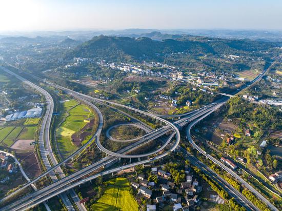 (资料图)汽车行驶在四川省广安市广安区沪蓉高速与银昆高速互通的广门枢纽段。中新社发 张国盛 摄