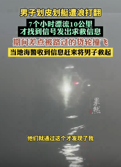皮划艇被浪打翻男子海上漂流7小时 绝望漂流终获救!5月29日,广东一名男子分享了自己在庙湾岛附近划皮划艇时遭遇的惊险经历。他在海上遇到了测浪船被打翻的情况,手机没有信号且大船无法看到他。在这段时间里,他还差点撞上了一艘货轮,在海中绝望地漂流了七个小时,漂流了大约10公里后才找到信号发出求救信息。最终,当地海警等部门经过一个多小时的搜寻,成功将该男子救起。
