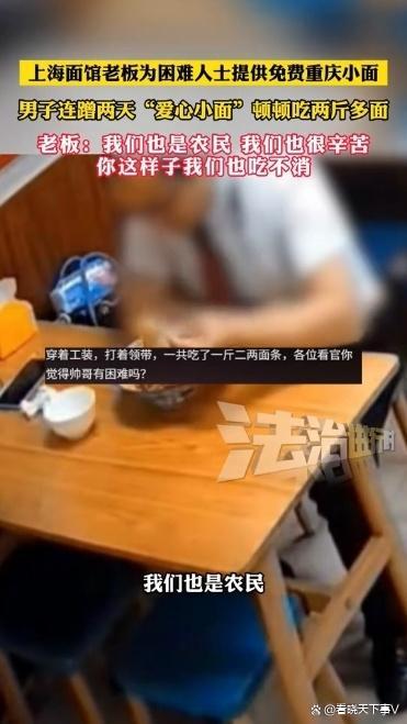 在上海的一家面馆里,老板为了帮助遇到困难的人,推出了免费的重庆小面。只要顾客进店说一句“来碗重庆小面”,就可以免费享用,无需付款。然而,一名穿着西装、打着领带的男子却连续两天来吃,并且每次都要吃二斤。这让老板感到非常困扰。
