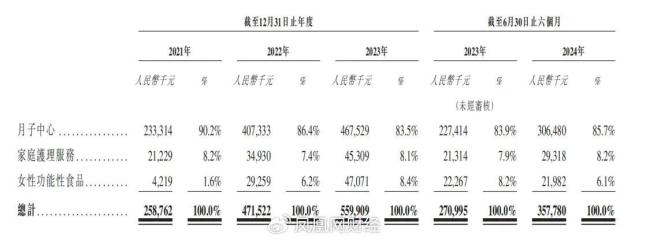 根据招股书披露,圣贝拉集团的核心业务涵盖产后护理(月子中心)、家庭儿童护理服务及女性功能性食品三大板块。其中,月子中心业务构成集团主要收入来源,在2021年、2022年、2023年、2024年上半年分别贡献收入2.3亿元、4.1亿元、4.7亿元、3.1亿元,对总营收的贡献占比始终保持在8成以上。