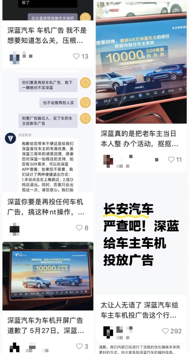 “往车机投广告,是不是有毛病?”“车机还敢打广告,不把车主的安全当一回事是吧?下次我是不是开车先看10秒广告才允许挂挡?”“车子是我的私有财产,打广告有经过车主允许吗?把用户安全和隐私当儿戏!”“深蓝你真是被刺到老车主脸上,是手机APP没地方给你投放广告吗?直接投到车机上。”不少车主在社交媒体上吐槽道。