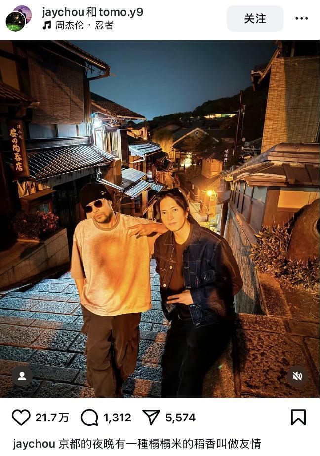 周杰伦在个人社交媒体账号上发布了一张与山下智久的合影,并配文“京都的夜晚有一种榻榻米的稻香叫做友情”。照片中,两人站在夜幕下的街道台阶上,默契地比耶,显得十分轻松。背景音乐是周杰伦2001年发行的专辑《范特西》中的《忍者》。
