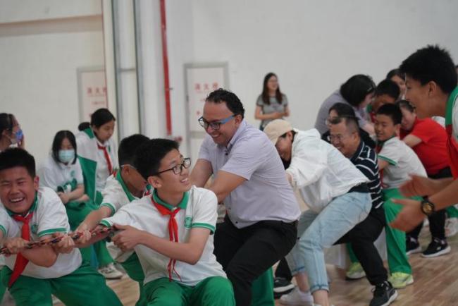 活动伊始,现场举行了放飞和平鸽仪式。随后,大使们在学生代表的引导下参观了校园,并与学生们进行了交流互动。活动中,学生们积极参与了包括“童心聚力”、“长绳飞花”、“零食快闪”以及拔河等环节。