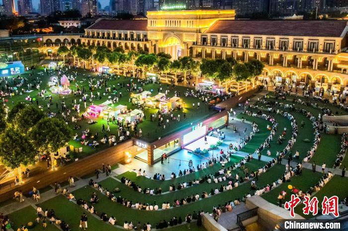 图为5月31日晚,市民和游客在天津民园广场打卡游玩。记者 佟郁 摄