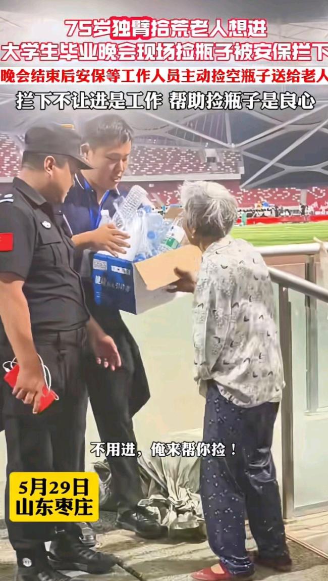 5月29日,大学生毕业晚会现场热闹非凡,五彩灯光照亮了校园夜空。这位衣着简朴、步伐蹒跚的老人走向晚会现场,她的眼神中带着一丝期待,希望能进入现场捡拾空瓶子。然而,安保人员出于对现场秩序和安全的考虑,将老人拦在入口处。大型活动现场需要严格管理,规则的存在是为了保障所有人的安全与活动顺利进行。