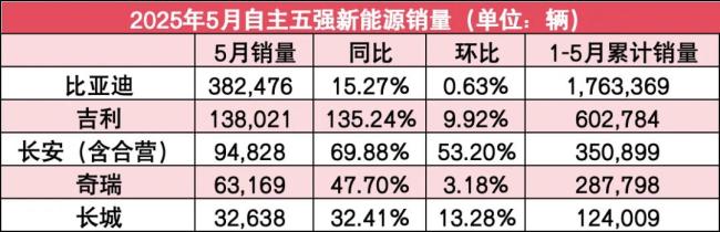 在这一市场大背景下,5月份,自主5强(比亚迪、吉利、长安自主、奇瑞、长城)全部呈现同比、环比双增长。其中,比亚迪依旧以38万辆+的成绩领先;吉利和奇瑞5月份也继续保持在20万辆以上;长安自主销量增长至18万辆;而长城依旧在10万出头的样子。从排名来看,5家销量排名与4月份保持一致。