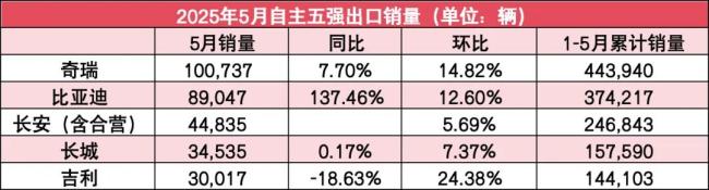 而在出口方面的竞争也越来越激烈。5月份,奇瑞的出口量为100,737辆,同比增长7.7%,环比增长14.82%,排在第一位。而比亚迪今年以来的出口也迎来爆发式增长,5月份,比亚迪出口量为89,047辆,同比增长137.46%,环比增长12.60%,创历史新高。随着比亚迪向出海发起猛攻,其将挑战奇瑞出口第一的位置。