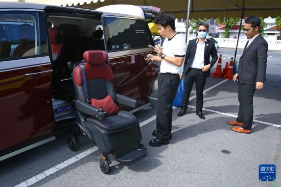 6月4日,在泰国曼谷举办的道路安全周活动上,工作人员展示广汽传祺M8 PHEV上搭载的轮椅。新华社记者 孙玮彤 摄