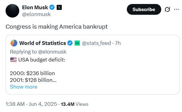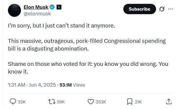 马斯克表示,这项庞大且荒唐的国会支出法案让他难以忍受。他认为支持这项法案的人应该感到羞耻,因为这将使美国预算赤字大幅增加至2.5万亿美元,并给美国公民带来沉重的债务负担。他指出,国会正在让美国破产。