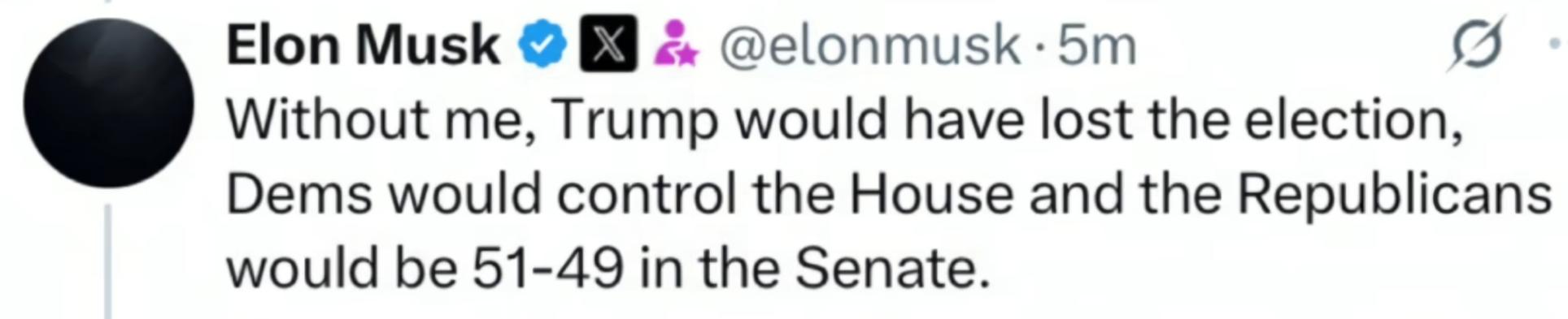 骂战不断升级马斯克发推文说:如果没有我特朗普会输掉选举。民主党将控制众议院和共和党参议院的支持率将为51比49。 还补充说了一句“真是忘恩负义啊”。