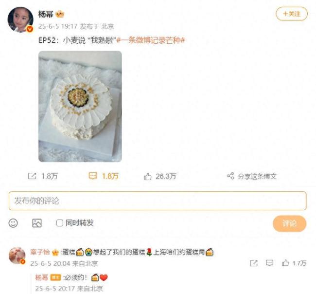 6月5日晚,杨幂在社交平台上晒出蛋糕图,章子怡评论表示希望在上海约个蛋糕局。