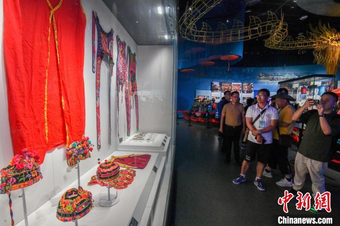 6月8日,海南陵水,海南疍家博物馆展出的疍家人婚庆服饰等,吸引参观者。中新社记者 骆云飞 摄