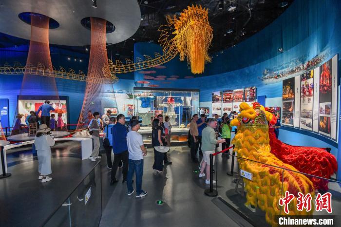 6月8日,海南陵水,海南疍家博物馆展出的舞狮场景吸引中外游客。中新社记者 骆云飞 摄