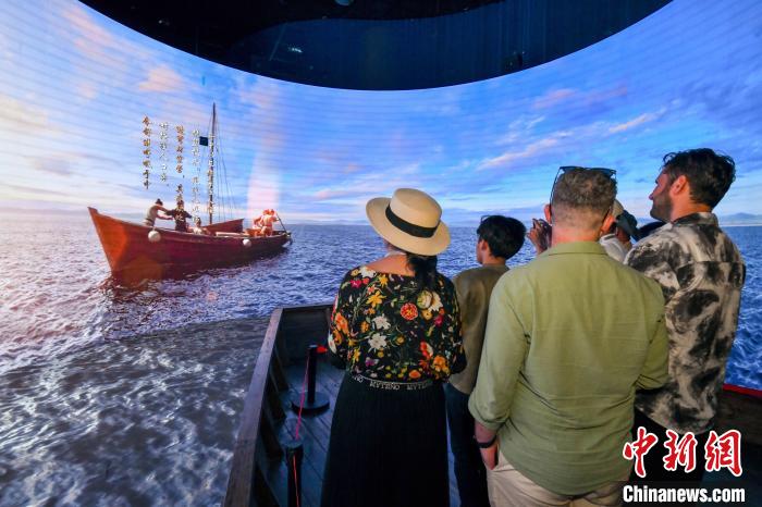 6月8日,海南陵水,游客在海南疍家博物馆观看疍家人下海采集珍珠场景的动画。中新社记者 骆云飞 摄