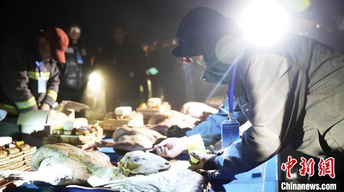 6月8日,工作人员正在做祭敖包之前的准备工作,为羊头点黄油。崔博群摄