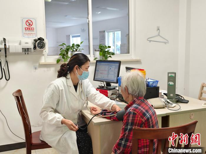 2025年,南浔区菱湖镇西栅社区卫生服务站,社区医生冯米雅正在为老人测量血压。项天琪供图