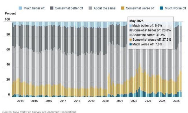 特朗普在贸易和移民政策上的转变也可能影响劳动力市场。多位美联储官员预计今年失业率将上升,但5月的调查显示,美国民众对就业和个人财务及股市前景的看法略有改善。就业方面,受访者预计未来12个月会失业的人比例降至14.8%,比之前下降了0.5%。受访者认为自己在未来一年内会被解雇的概率下降了0.5%,觉得自己有可能主动辞职的比例略微上升。预计未来一年失业率会更高的平均预期也下降了3.3%至40.8%,但仍高于过去12个月的平均值。