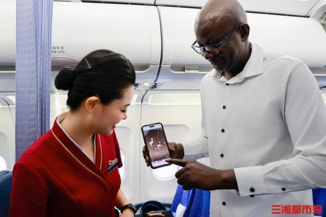 得知穆萨准备来湘的消息后,南航湖南分公司联合三湘都市报特别邀请他乘坐南航航班,由北京奔赴长沙。飞行过程中,乘务组为穆萨准备了一份特别的餐食——用洞庭湖水浇灌的湘米。