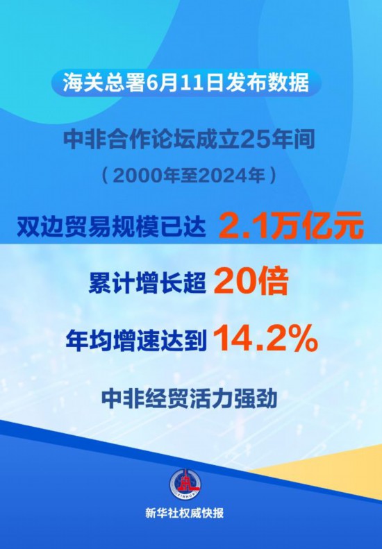 新华社北京6月11日电(记者张晓洁、邹多为)自2000年中非合作论坛成立以来,中非贸易规模屡创新高。海关总署11日发布数据显示,我国已连续16年保持非洲第一大贸易伙伴国地位,2024年,中非贸易规模首破2万亿元,达到2.1万亿元。