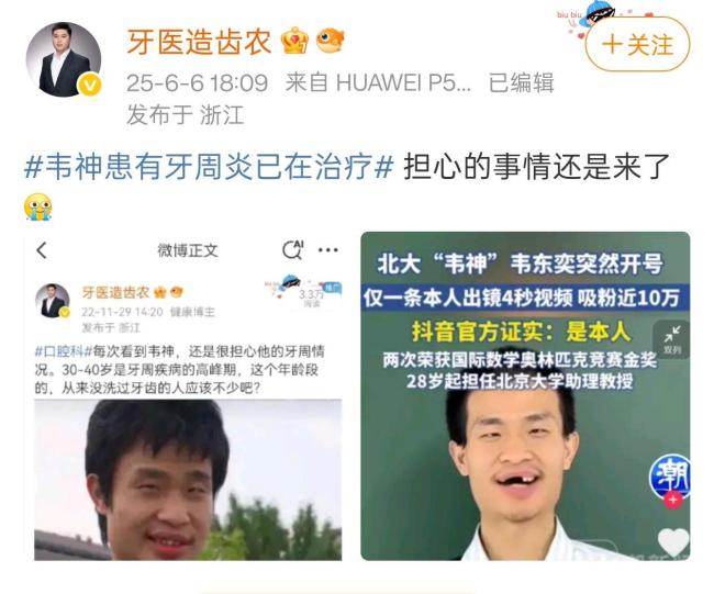 据了解,牙医造齿农是浙江省常山县人民医院口腔科医师陈亮,经常科普口腔医学知识。得知韦东奕目前牙齿状况堪忧后,陈亮发文表示,自己之前在新闻里看到韦东奕牙龈萎缩,牙齿有轻微移位的样子,猜测是牙周炎。牙周炎会造成牙龈出血溢脓、牙齿松动移位,最终导致脱落。