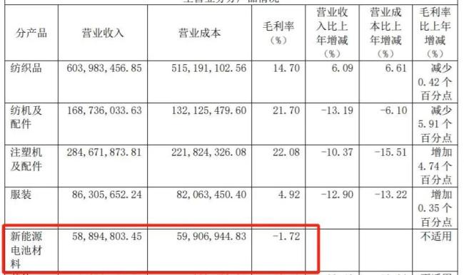 通过对金鹰股份历史财报的梳理后发现,新能源首次出现在金鹰股份财报中是在2017年,金鹰股份仅以文字叙述了新能源未来的发展趋势;第一次出现新能源营收数据是在2019年,彼时金鹰股份新能源电池材料营收为5889万元,毛利率为-1.72%。