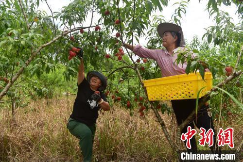 果农在采摘桃子。中新网记者 张丽君 摄。