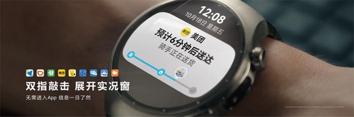 HUAWEI WATCH5全新升级支持“划一划”和“敲一敲”两种手势,带给用户实用便捷的智慧交互能力。用户无需触碰手表屏幕,就能通过拇指从食指第二指关节侧面连续向指尖划动两次(划一划)实现选项切换,或通过拇指和食指指尖互点两次(敲一敲)来确认选择。目前,智慧手势能力已经开放给了广大生态合作伙伴。例如,在HUAWEI WATCH5上,用户无需进入App,通过双指“敲一敲”,就可以展开高德地图、滴滴出行、航旅纵横、美团、美团外卖、航班管家、高铁管家、飞常准、智能关怀等应用的实况窗,快速获取外卖订单或高铁/航班/打车的实时动态。