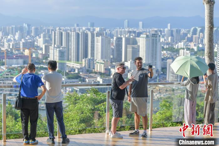 6月7日,爱尔兰博主卢克和他的表弟亚历克斯在三亚鹿回头风景区拍照留念。中新网记者 骆云飞 摄