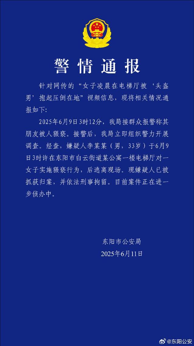 东阳市公安局通报称,6月11日23时许,警方针对网络流传的一段视频发布警情通报。经查,6月9日3时12分,警方接到群众报警称其朋友遭人猥亵。接警后,东阳警方立即组织精干警力赶赴现场调查。通过调取监控视频和现场勘查,警方迅速锁定嫌疑人李某某。监控视频清晰记录了李某某从背后抱住受害人,并将其按压在地的整个过程。