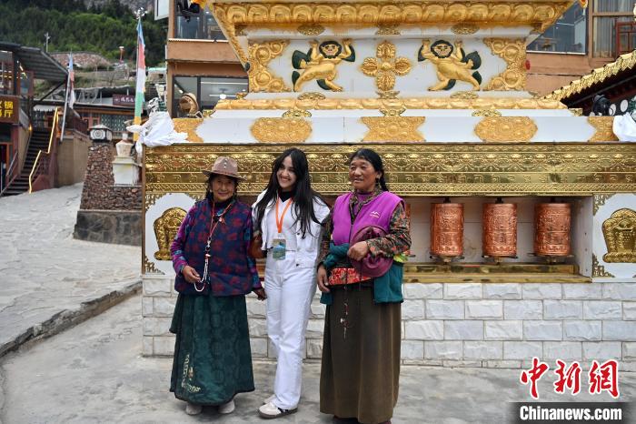 6月11日,甘肃迭部县扎尕那村,迪拜中阿卫视主持人阿思玛(中)与当地居民合影。九美旦增 摄