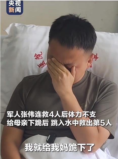 张伟跪母为何让人泪流满面 忠肝义胆催人泪。近日,商丘籍少校军官张伟跃入湖中连救5人的事迹感动了无数人。那天,张伟连续救出4个人后,已经精疲力尽。岸上守候的母亲见状劝他不要再下水了。然而,张伟向母亲磕了个头,说:“妈,我是军人,请您让我再救一个。”然后义无反顾地转身跳进湖中。