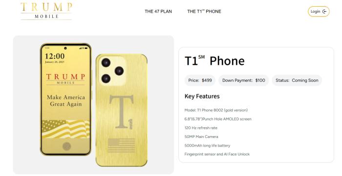 T1手机外壳为金色金属材质,并镌刻美国国旗图案。根据Trump Mobile网站发布的宣传图,这款手机屏幕显示出特朗普的知名竞选口号“让美国再次伟大”(Make America Great Again,MAGA)。目前这款手机的预售价格为499美元。